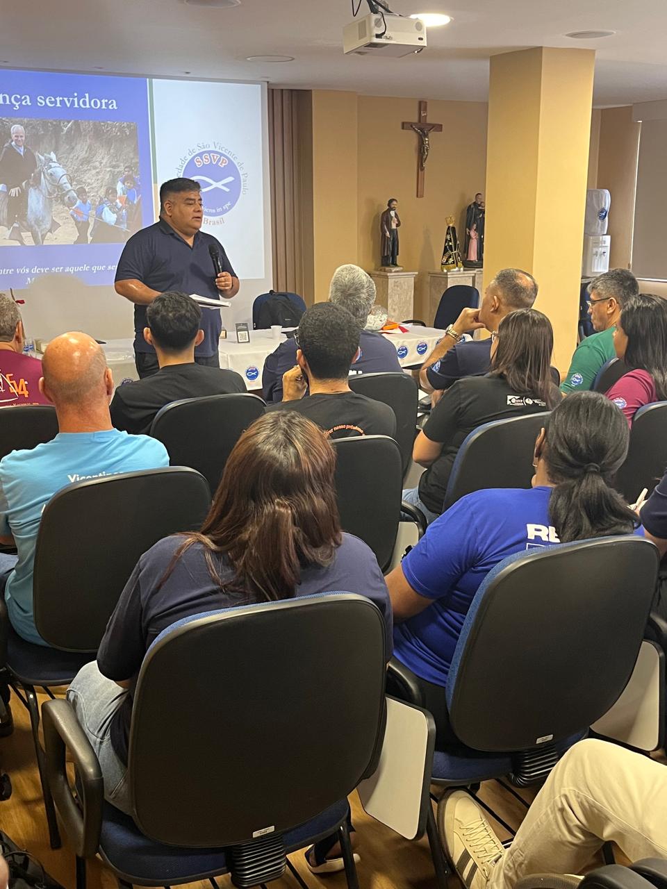 A irmã Carolina Mureb, Filha da Caridade, trouxe à nova Diretoria uma reflexão profunda baseada em oito das 12 lições do Papa Francisco. “Quando vocês assumem essa missão, vocês precisam fazer na perspectiva cristã, dar a vida, dar a vida aos Pobres, dar a vida aos vicentinos, é uma doação, um comprometimento. Serviço de liderança significa animar os vicentinos a viverem o carisma e a se comprometerem com a missão. Estamos aqui para servir”, definiu.